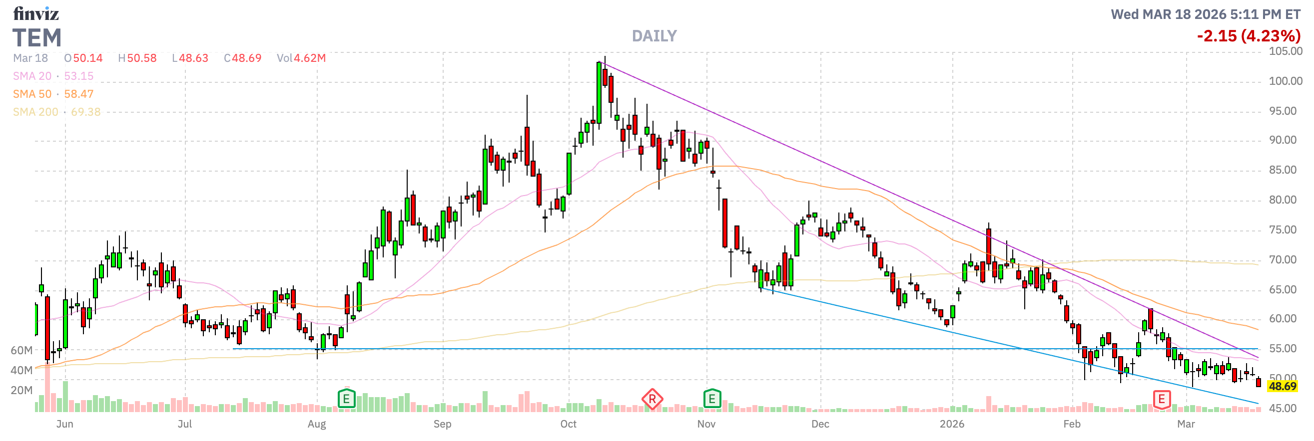 - Tempus AI, Inc. has declined 50% from highs, now trading near support despite robust above $50, despite good Q4 results and strong organic growth.